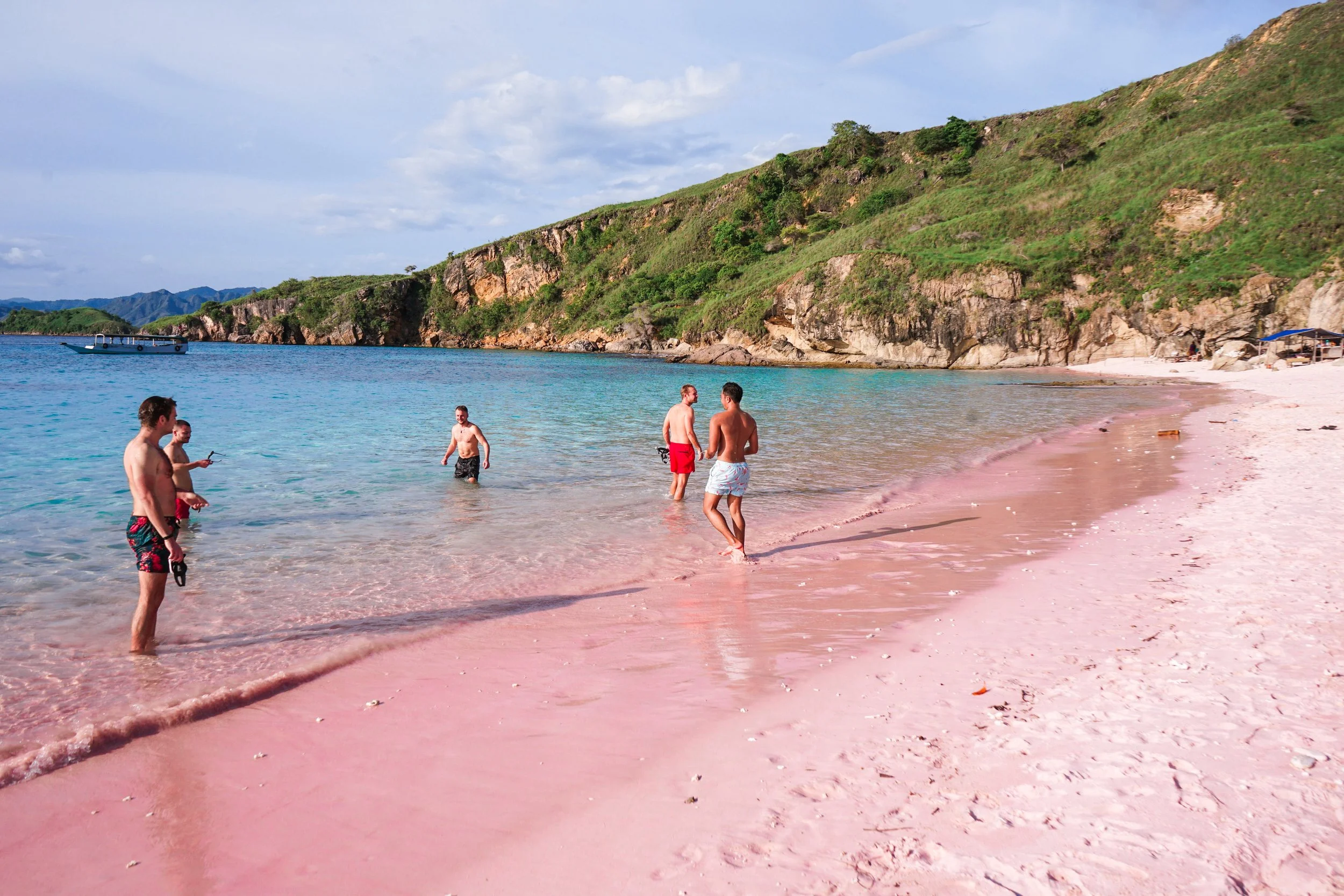 A scenic adventure destination in Flores. Clear blue water meets the pink sand with majestic hills in the background.